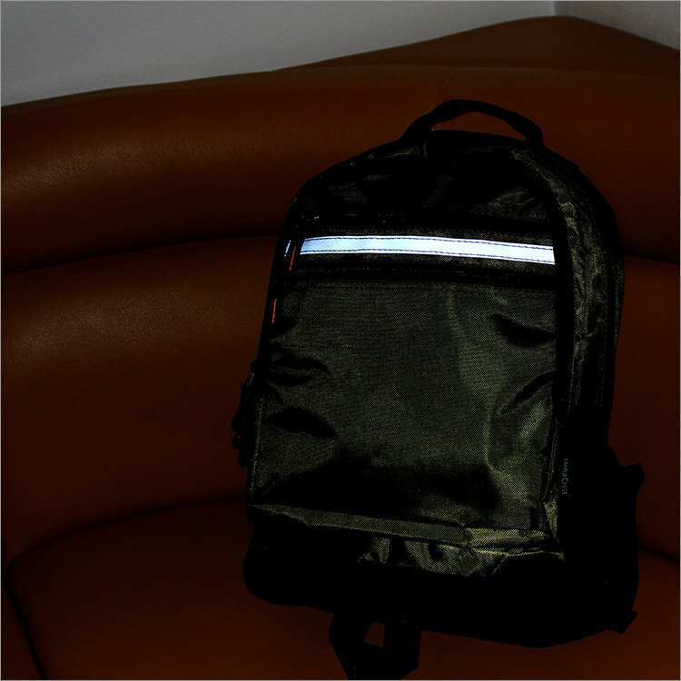【Alpha Crest 反射テープ付きリュック】 夜道での安全対策を考慮し、上部に反射テープが付いたリュックサック。