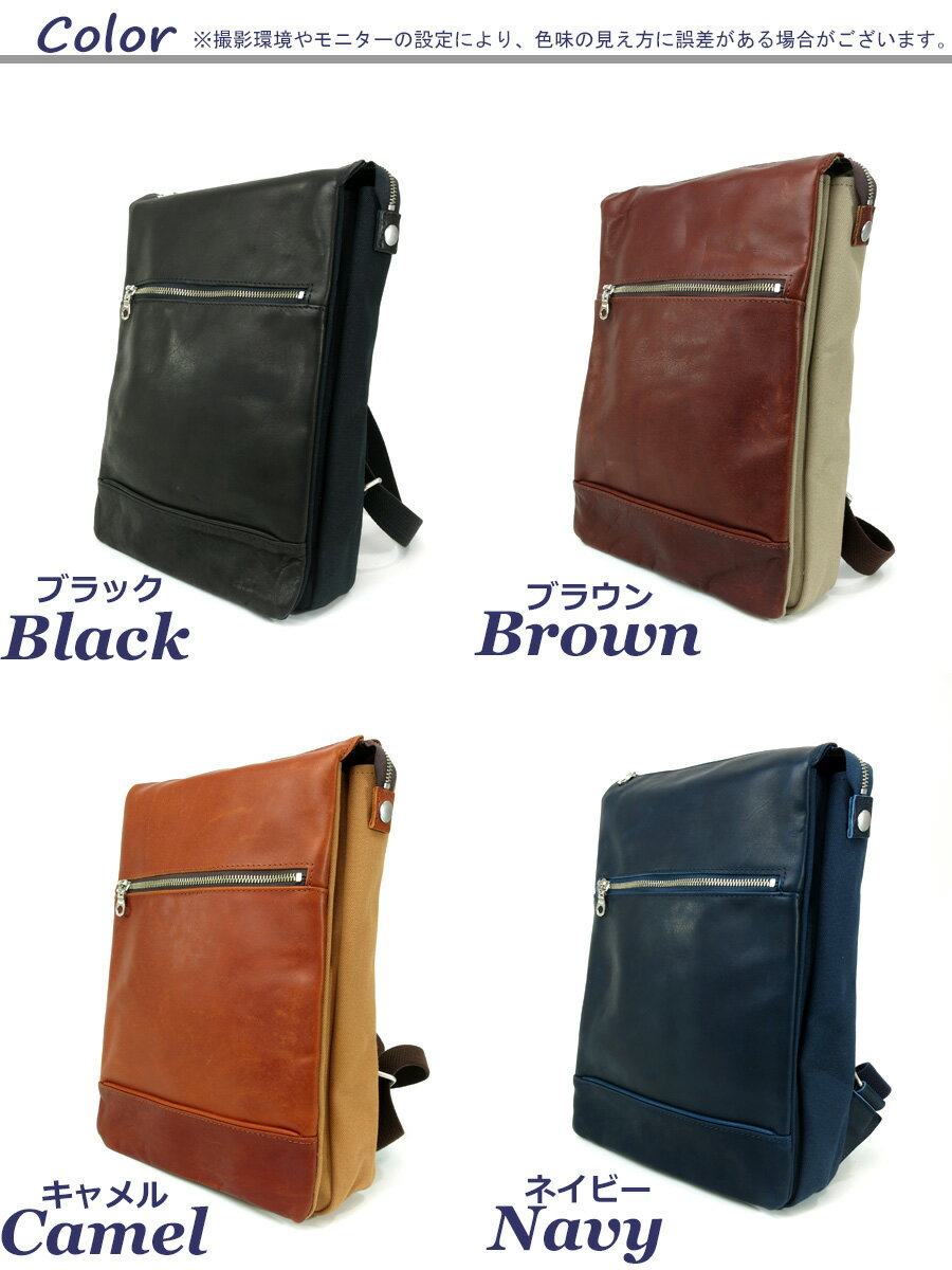ギフト対応 商品詳細 商品番号 YNM-214 仕様 ■サイズ(概寸表記) タテ33cm×ヨコ23cm×幅10cm ■重さ 647g ■本体開口部 22cm サイドファスナー:21.5cm ■ポケット(計4つ) ○外ポケット:1つ タテ14cm×ヨコ16.5cm ○内ポケット:3つ ■ショルダーストラップ 幅:3cm 長さ:53cm〜99cm スライド式(無段階調節) ■持ち手 幅:1.4cm 長さ:18.5cm 高さ:3cm カラー ○ブラック ○ブラウン ○キャメル ○ネイビー 素材 グローブレザー×6号帆布 原産国 日本製(made in JAPAN) 特徴 手触りのソフト感と強くしなやかさを求められる「野球グローブ」に使用させる牛革を使用したリュックサックです。